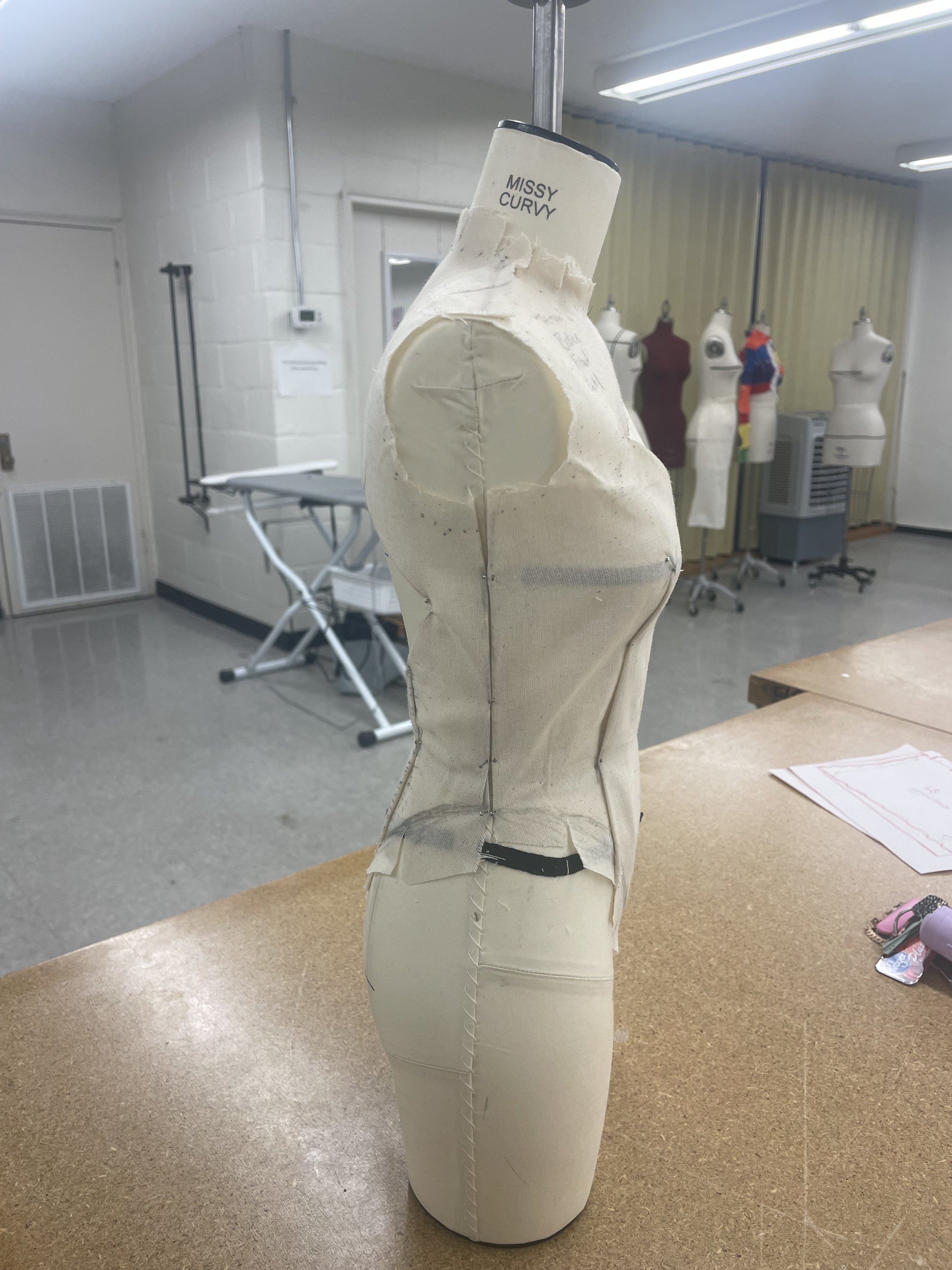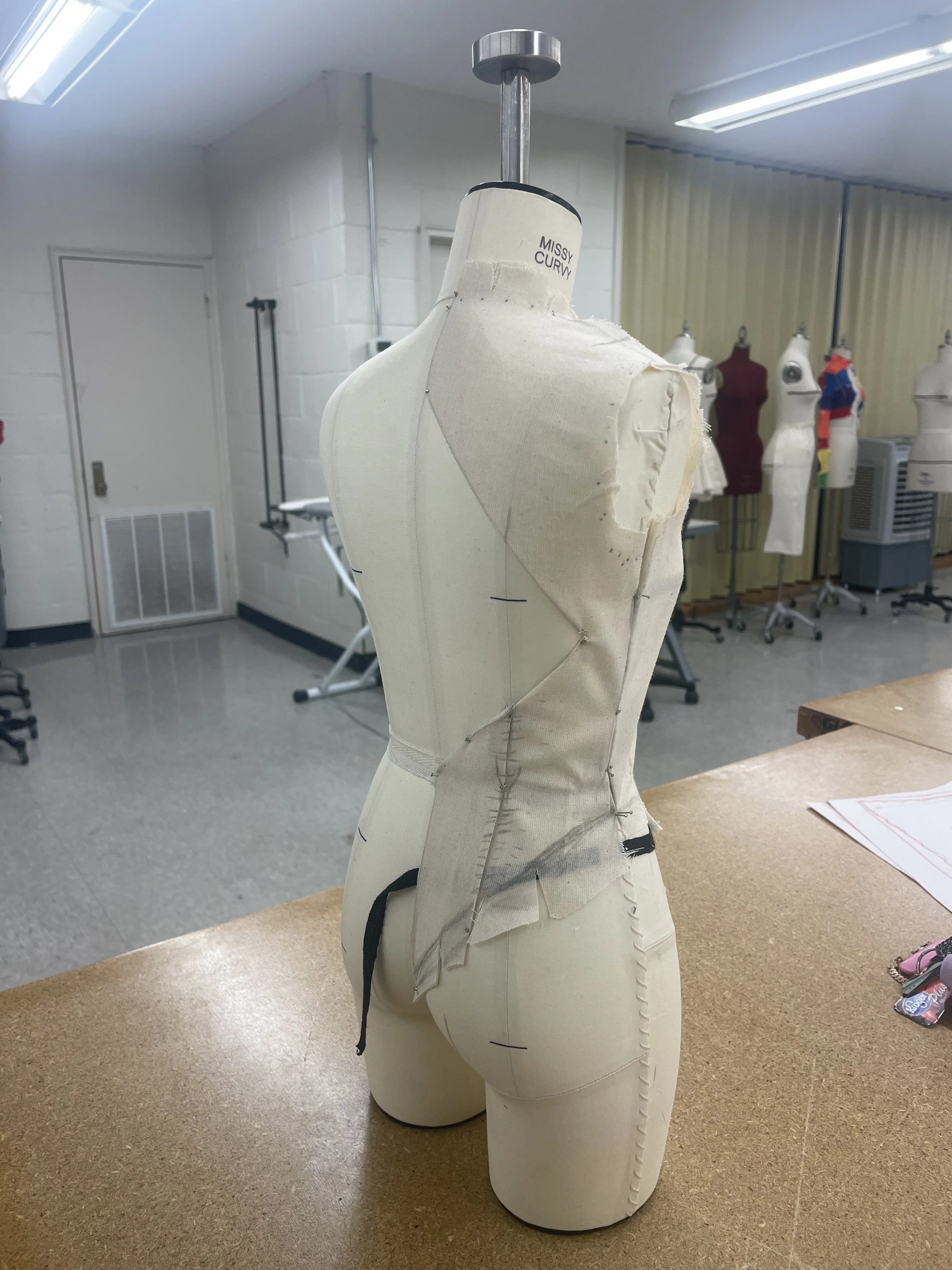 Taetum Sinclair sourced ballet performance costumes and deadstock fabrics to create her garments for the ‘25 Trashion season. Starting with sketching and creating a mood board the design process developed through pattern drafting and toiles.