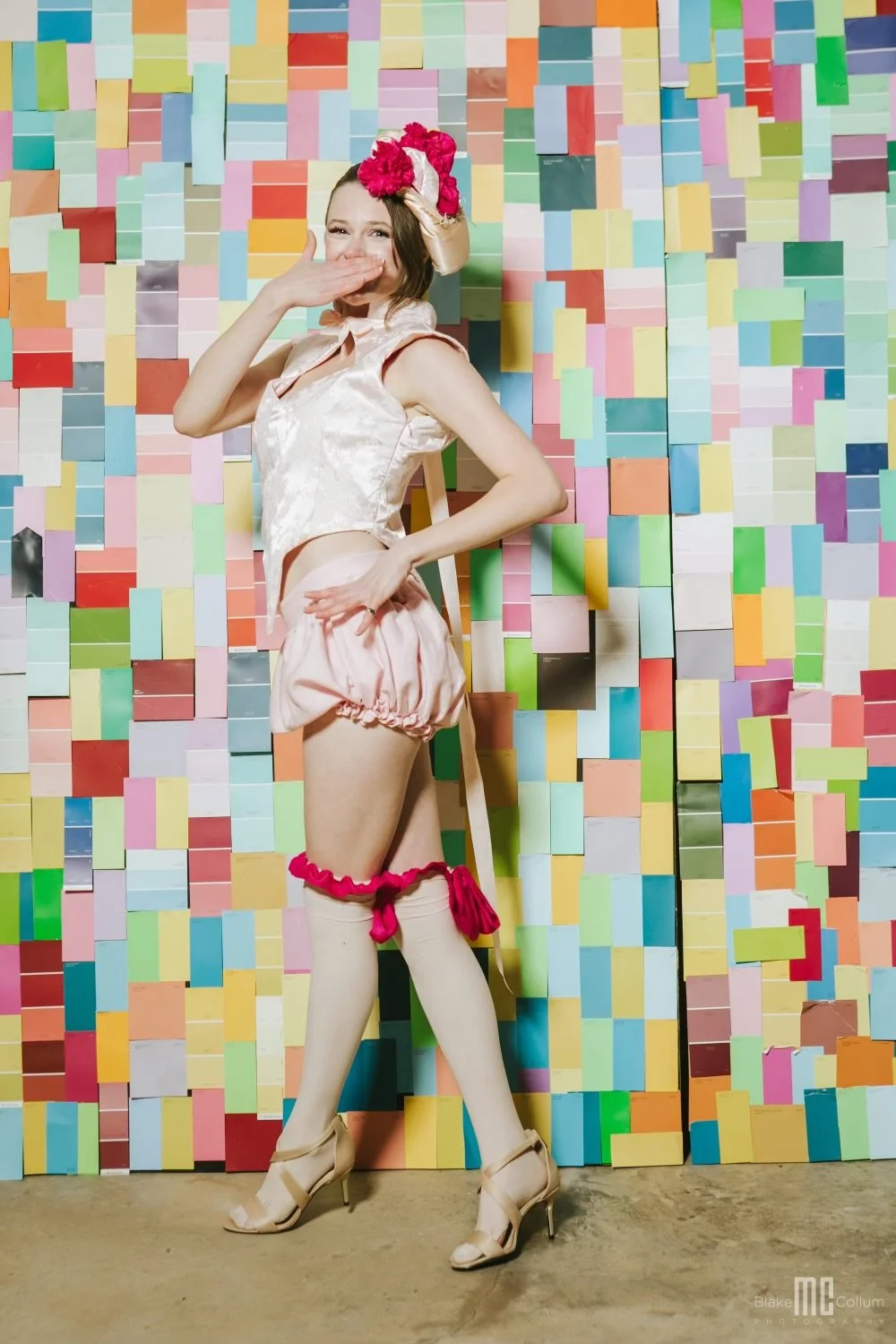 Crafting the top from deadstock polyester with panels pulled from used costume pieces and the shorts from deadstock linen and a reused zipper, Sinclair wanted to stay true to traditional a ballet color palette while introducing playful jester-like themes. The look was topped off with a ballet shoe filled with regenerative silk flowers crafted into a headpiece.